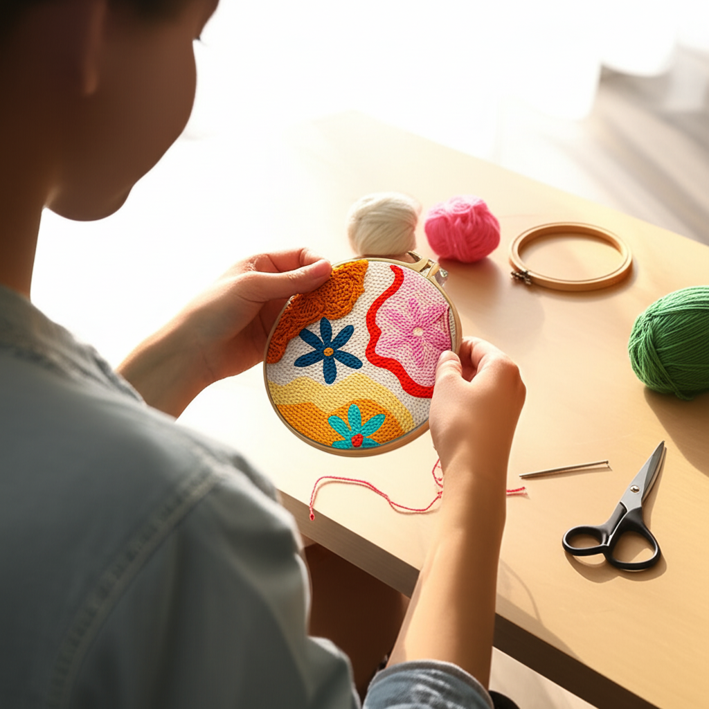 - Accessoires inclus : Tissu de broderie pré-imprimé, assortiment de fils à broder colorés, cerceau de broderie, aiguille à punch needle, livret d'instructions.